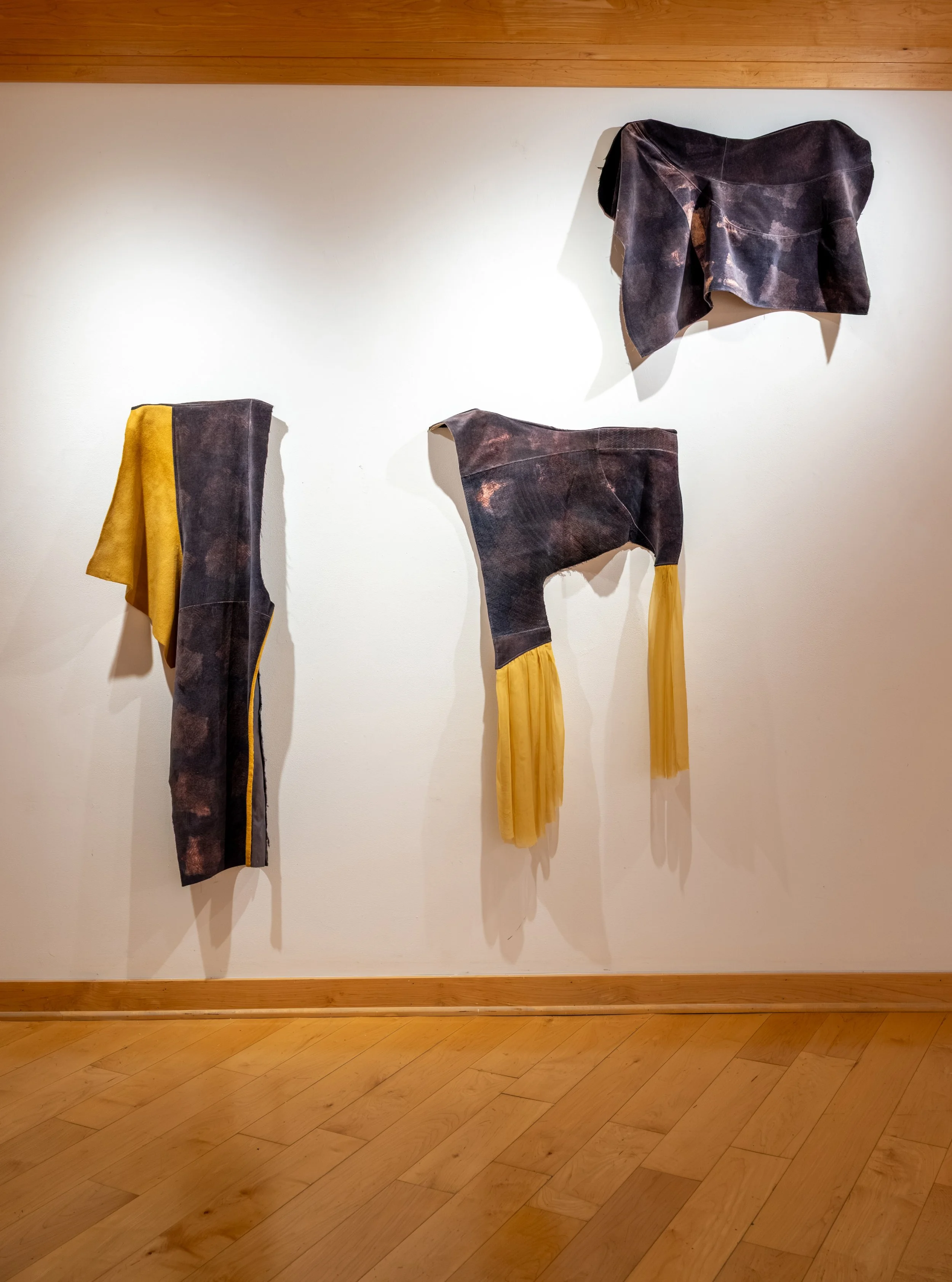Screen print on velveteen, natural dye extract, synthetic dye, sewing thread, wood