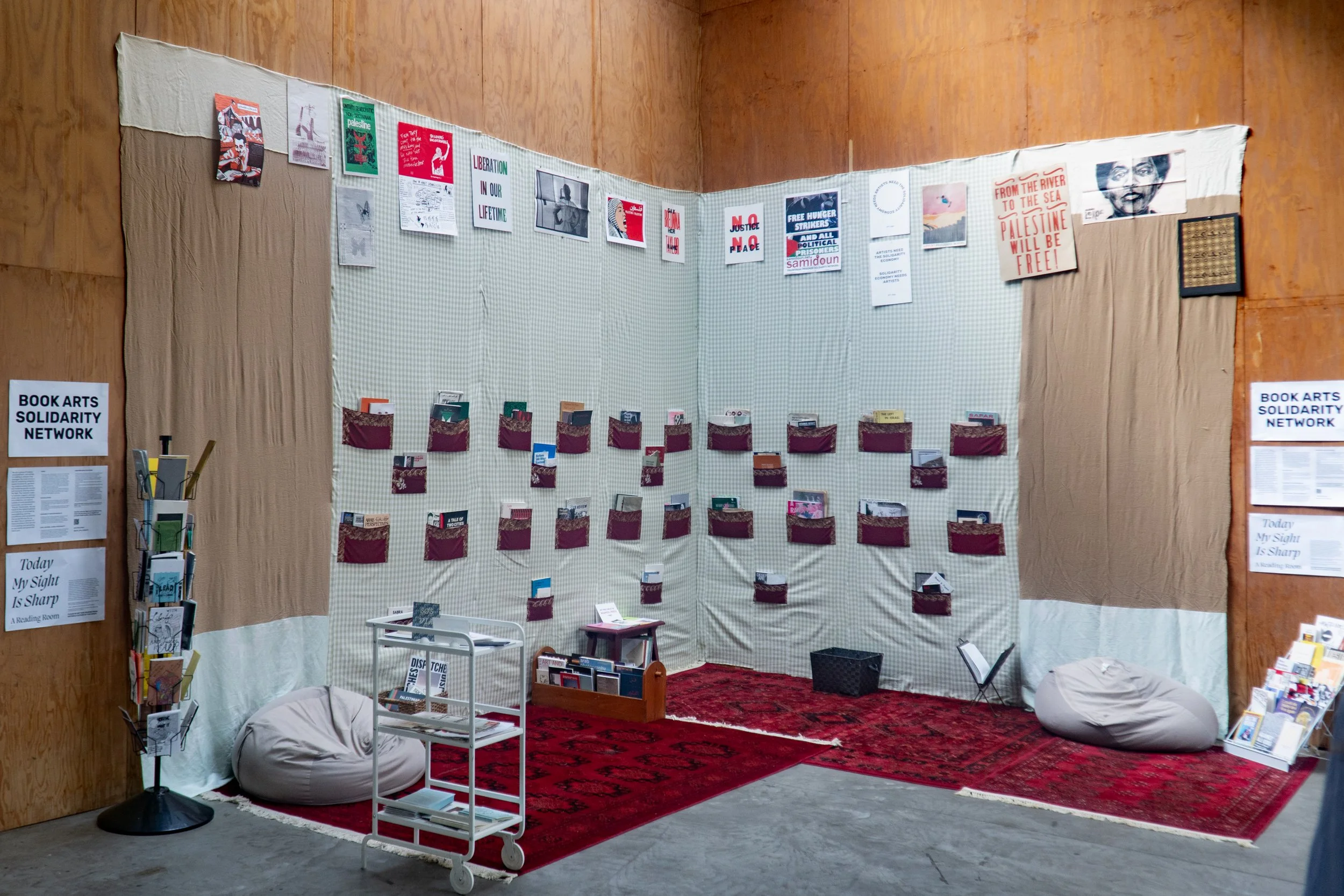 This non-circulating library is a culmination of five Book Arts Solidarity Network members’ books, prints, ephemera, zines, brochures, and other printed reference material sourced from their personal collections. The selection is based on the collective’s mission to activate book arts as a tool for mobilizing solidarity-based movements, in particular the liberation struggle in Palestine and anti-imperialist movements across the SWANA (South West Asian, North African) region. Each book is hand-picked for fair attendees to read, photograph, and take inspiration from as you weave in and out of the fair and accompanying events.